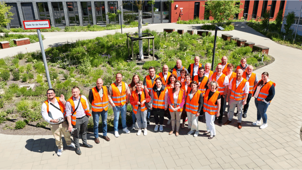 Im weiteren Verlauf erhielten die Teilnehmenden bei einem Rundgang über das Gelände des Umweltbetriebs der Stadt Bielefeld praktische Einblicke in aktuelle Projekte. In zwei Gruppen wurden unter anderem der Einsatz von Drohnen bei der Bauüberwachung sowie die Entsiegelung des Innenhofs thematisiert. Drohnen ermöglichen es, Baufortschritte effizient zu dokumentieren und schwer zugängliche Bereiche einfach zu erfassen – eine sinnvolle Ergänzung zu herkömmlichen Überwachungsmethoden. Im Innenhof des Betriebs wurde mit der Entsiegelung von Flächen ein aktiver Beitrag zur Klimaanpassung geleistet. Statt Beton dominiert hier nun eine naturnahe Gestaltung mit Staudenbeeten und Rückhalt von Regenwasser in der Fläche. Die hydrologischen Effekte werden kontinuierlich durch Sensorik überwacht.