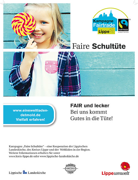 Die ProduzentInnen fair gehandelter Waren (u.a. Kakao, Zucker, Kaffee, Tee) erhalten faire Löhne und können damit ihrer Existenz und die ihrer Familien sichern. Auch wird die Schulbildung in den Produzentenländern gefördert. Mit dem Projekt „Faire Schultüte“ möchte der Kreis Lippe einen Beitrag zur Unterstützung des Fairen Handels leisten. Durch Information und Angebote will das Projekt erreichen, dass die Schultüten der Kinder mit Produkten des Fairen Handels bereichert werden.