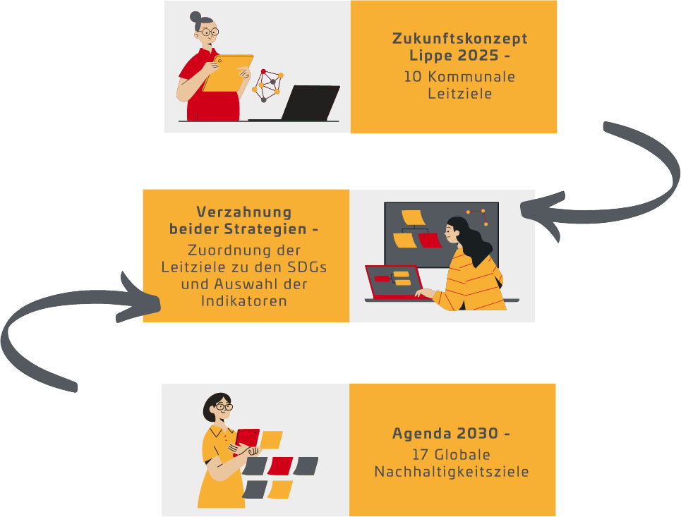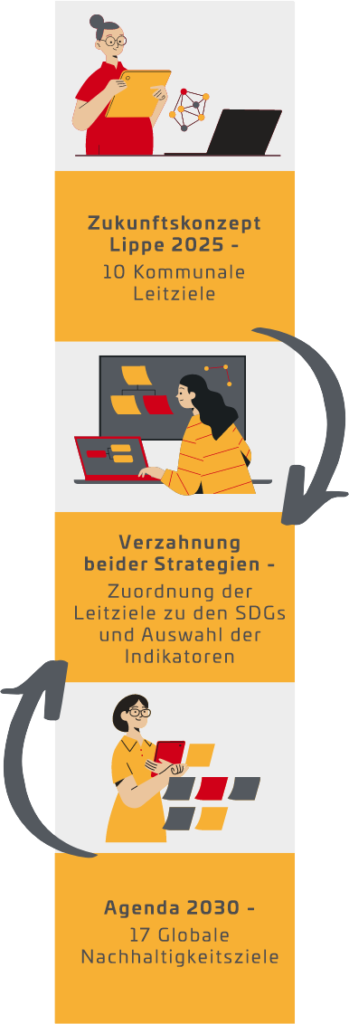 Ziel des Projektes ist es, für alle Aufgabenbereiche des Kreises Lippe Indikatoren als Anzeiger für eine nachhaltige Entwicklung zu identifizieren. Mithilfe dieser Indikatoren wollen wir zukünftig Fragen beantworten wie zum Beispiel: Sind wir auf dem Weg, eine hochwertige Bildung zu gewährleisten oder wirksame Maßnahmen zur Bekämpfung des Klimawandels zu ergreifen? Dabei wird auch die Übertragbarkeit bereits vorhandener Indikatoren des Modellprojekts der Bertelsmann Stiftung zum kommunalen Nachhaltigkeitsmanagement überprüft.