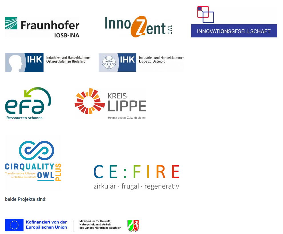Eine gemeinsame kostenfreie Veranstaltung von Fraunhofer IOSB-INA (Projekt CirqualityOWL plus), InnoZent OWL e.V. (Projekt CE:FIRE), der Innovationsgesellschaft mbH, IHK Ostwestfalen zu Bielefeld, IHK Lippe zu Detmold, Wirtschaftsförderung Lippe, Effizienz-Agentur NRW.